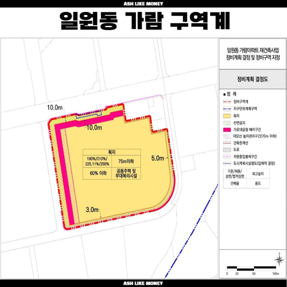 사업면적은 12,446평이며 기존 용적률은 109%이고 용적률 최대 250%까지 상향된다. 기존 연면적은 13,566평이고 최대 연면적은 31,115평이 나온다. 비록 2종용도지역이라 용적률 상향이 낮지만 기존 용적률이 워낙 낮아 정비기반시설 5% 1,555평, 임대주택 면적을 20% 6,223평, 근린생활시설 1천평으로 높게 가정했다. 최대 연면적이 31,115평이므로 일반분양 면적은 8,771평이 나온다.