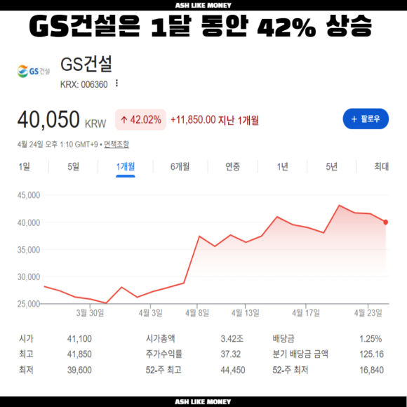 가장 핵심으로 수혜를 받는 것이 건설주들이다. GS건설주는 현재 43,000원까지 올랐고 하루 만에 9~10% 이상이 증가하는 모습을 보여주었다. 2월~3월 동안 1만원에서 2만원까지 놀던 주식이었으나 4월에는 전쟁 휴전과 재건에 대한 관심이 많아져 거의 2배 가까이 올랐다. GS건설은 과거 중동에 정유, 석유화학 플랜트 공사를 지은 경험이 많다. 또한, 대형 EPC 능력을 보유하고 과거 중동 프로젝트를 수행한 경험이 있어 중동과 네트워크를 구축하고 있다.