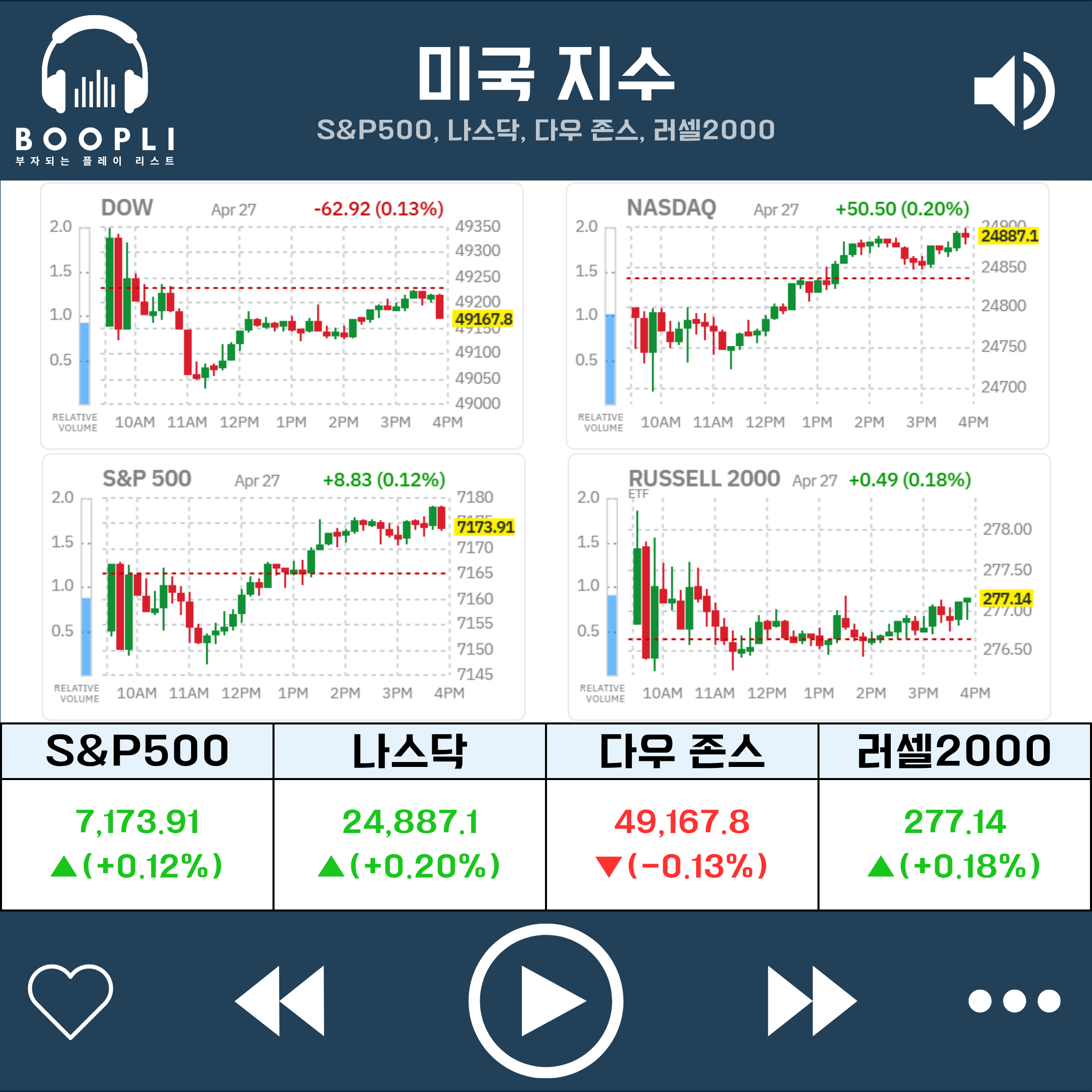 전일 미국 증시는 미·이란 협상 교착과 호르무즈 해협 긴장 지속에 따른 유가 급등, 대형 기술주 실적 발표 및 FOMC를 앞둔 관망 심리가 복합적으로 작용하며 다우(-0.13%)는 약보합, S&P500(+0.12%), 나스닥(+0.20%), 러셀2000(+0.18%)은 강보합으로 혼조세 마감