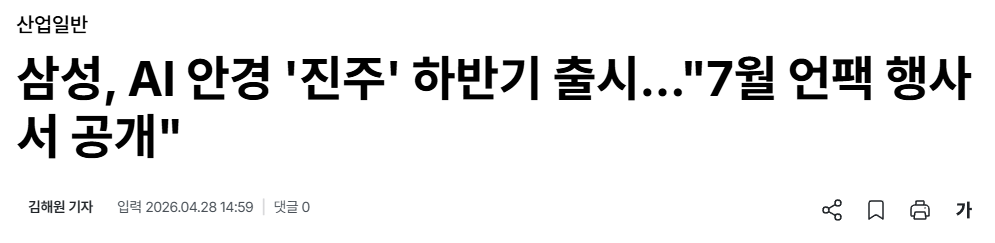 오늘은 삼성 AI 글라스 출시 예정 기사를 보고 이랜텍 리포트를 작성해보고자 합니다.