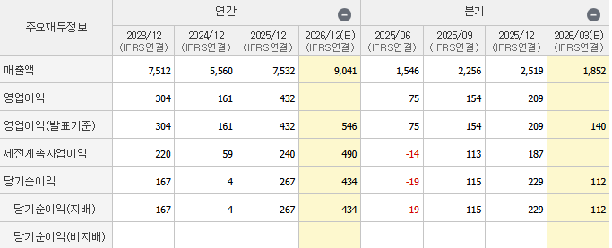 2026년에는 유럽향 배터리팩 배터리관리시스템 매출이 발생하기 시작하면서 ESS(에너지저장장치) 매출액 성장이 나타날 것으로 판단되어 증권사에서는 연간 매출액 9,041억원, 영업이익 546억원을 기록할 것으로 전망하고 있습니다.