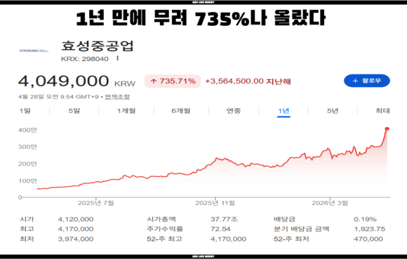 효성중공업의 주가는 4월 28일 기준으로 405만원이다. 1개월 동안 무려 60% 이상이 상승하여 157만원이나 올랐다. 1년 전만 해도 45만원으로 100만원도 못 넘던 효성중공업이 황제주로 등극하면서 6천 코스피의 수혜를 그대로 받았다. 6천 코스피를 이룩한 주요 원인은 "반도체 초호황 사이클" + "AI의 인공지능" + "로봇기술"이다. 반도체는 SK하이닉스, 삼성전자이고 AI는 냉각기나 광반도체, 전력기기, 로봇은 2차 전고체 배터리나 현대차의 아틀라스가 대표적이다.