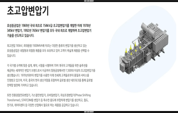 효성중공업은 변압기 제조업과 건설업이 주요 업종이고 전력망 안정화 솔루션, 수소 에너지, 신재생 에너지, 디지털 솔루션 등 다양한 분야의 사업을 운영하고 있다. 우리가 아는 "해링턴 플레이스"가 효성의 아파트 브랜드이다. 그런데 효성의 아파트 브랜드 가치는 GS건설, 대우건설, 삼성물산, 현대힐스테이트에 비해 떨어진다. 하지만 효성중공업의 진가는 전력설비 솔루션과 발전기 부분이다.