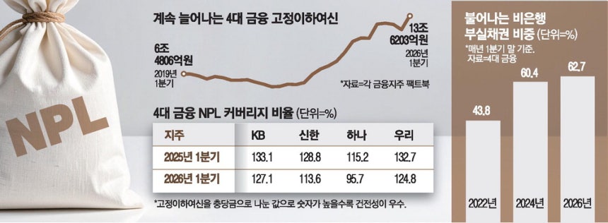 매일경제신문의 보도에 따르면 KB, 신한, 하나, 우리 등 4대 금융지주의 고정이하여신(NPL) 잔액은 올해 1분기 사상 최대치를 경신했으며, 이 부실의 63%가 은행이 아닌 카드, 캐피탈, 저축은행 등 비은행 계열사에서 발생했음