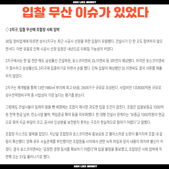 성수2구역은 작년 시공사 선정 입찰이 한 차례 무산된 사례가 있다. 당시 현장설명회에는 포스코이앤씨를 포함하여 삼성물산, 대우건설, DL이앤씨, SK에코플랜트, 두산건설, 금호건설 등의 9개 시공사가 참여했지만 실제로 본입찰에는 아무도 참여하지 않았다. 조건이 꽤나 까다롭기 때문인데 성수2지구 조합 측에서 요구한 것이 "입찰보증금 1천억 전엑 현금납부, 컨소시엄 불허, 책임준공 확약 등"이 대표적이다.