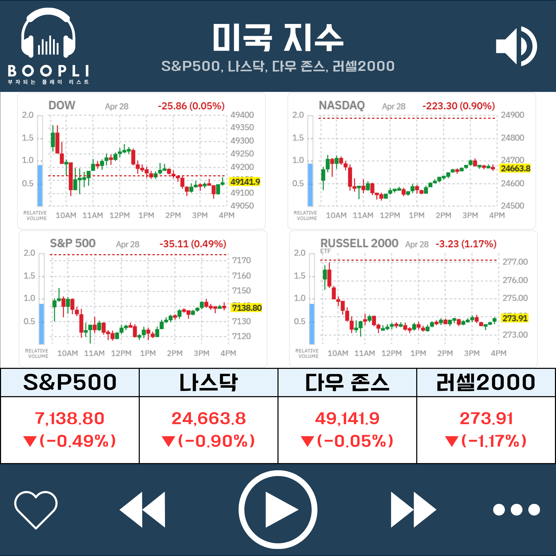 장 후반에는 미 재무부가 이란에 호르무즈 통행료를 지급할 경우 제재 대상이 될 수 있다고 경고하면서 지정학적 긴장감이 이어진 가운데, 빅테크 실적 발표를 앞둔 기대감과 저가 매수세가 일부 유입되며 낙폭이 다소 축소됐으나 전반적인 약세 흐름을 되돌리기에는 제한적이었고 주요 지수 모두 약세로 마감