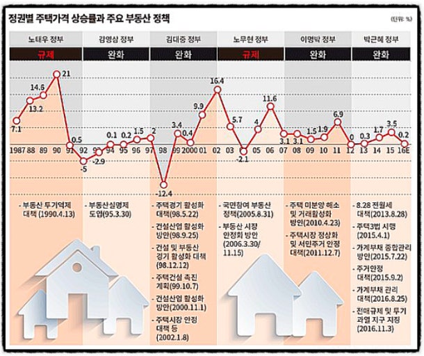 위의 자료를 보면 노태우 정권, 노무현 정권과 문재인 정권에서 규제 정책을 펼쳤고 나머지 정권에서는 완화 정책을 펼쳤다. 현재 정권에서도 완화 정책을 펴펼치고 있다.
