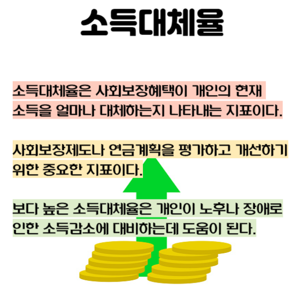 소득대체율이란 생애평균소득 대비 노후에 받을 수 있는 연금 수령액의 비율이다. 연금의 보장성을 보여주는 대표 지표로 우리나라 국민연금은 가입기간이 40년 일때를 기준으로 소득대체율을 정하고 있다. 일하는 40년 동안 월 소득의 9%를 내면 은퇴한 뒤에는 일할 때 벌던 소득의 40%를 연금으로 받는다.