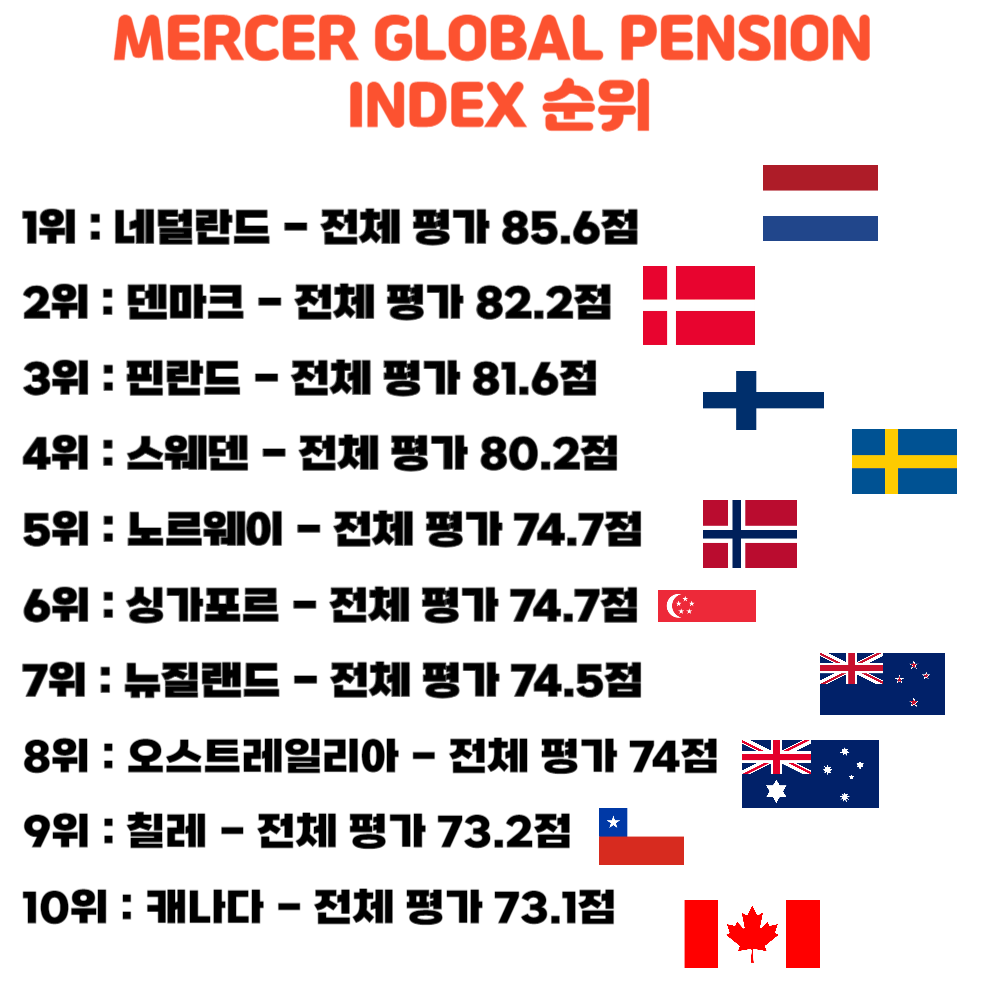 21년 기준으로 MERCER라는 연금제도 평가를 위한 기관에 의해 발표된 자료이다. MERCER'S GLOBAL PENSION INDEX는 연금제도 평가를 위한 글로벌 펜션지수를 발표하기 위해 연금시스템의 성능, 지속 가능성, 친화적 요소 등을 기준으로 순위를 책정한다.