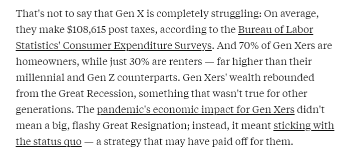 위의 내용에서 보면 미국 X세대의 평균 소득은 대략 우리나라 기준 1.3억원 정도입니다(환율 1,300원 정도 적용 시). 그리고 놀랍게도 70%는 자가를 보유하고 있고(!) 30%정도만 월세 살이를 하고 있다고 합니다. 소득이 높고, 자산을 상당수가 보유하고 있음에도 경제적으로 어려움을 느끼는 세대라는 것입니다.